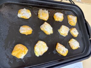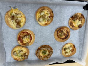 きくぐみでは、餃子の皮に枝豆とウインナーをのせ、チーズを加えて焼いた「おつまみ風ピザ」を作りました。