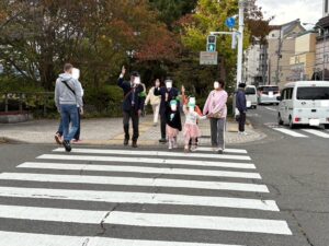 道路の角での安全確認や、信号機のある横断歩道での渡り方を一人ひとり丁寧に見ていただき、子どもたちは少し緊張しながらも真剣な表情で取り組んでいました。渡り終えた後には「とても上手だね。」と褒めていただき、嬉しそうな笑顔を見せていました。