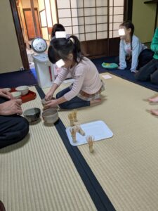 茶道では、一人ひとりが丁寧にお抹茶を点て、お友達に「どうだった?」と感想を聞き合う姿が見られました。お互いの点てたお抹茶を褒め合う姿はとても微笑ましく、思いやりの気持ちや相手を尊重する心が育っていることを感じました。
