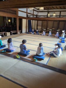 座禅では、冷んやりとした秋の空気を感じながら、静かな時間を過ごしました。背筋を伸ばして座る姿からは、集中する力や落ち着く心が育まれていることが感じられます。