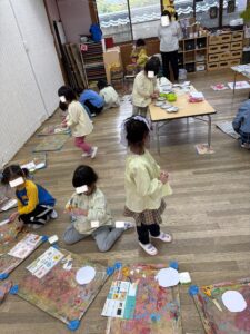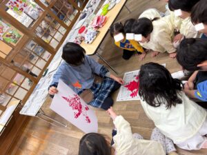 版画は、絵を描いて、型取り切り、つなげて、インクをつけて、紙に写す…と、いくつもの工程がある少し難しい活動。でも、4・5歳になった子供達は、手先もぐんと器用になり、集中して取り組めるようになってきました。