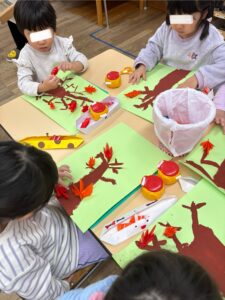 今回は、秋の自然を感じながら「紅葉の木」を作りました。遠足で訪れた植物園の木々が赤や黄色に色づいていたことを思い出しながら、それぞれが思い描いた木の絵に、折り紙で作ったもみじを丁寧に貼り付けました。
