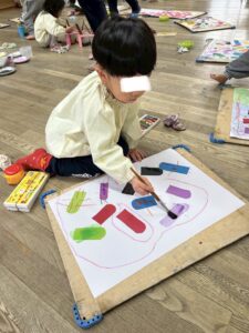 制作が始まると、色とりどりの“クレヨンくん”に見立てた画用紙の中から好きな色を選び、思い思いの絵を描き込んで楽しんでいました。