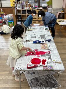 版画は、絵を描いて、型取り切り、つなげて、インクをつけて、紙に写す…と、いくつもの工程がある少し難しい活動。でも、4・5歳になった子供達は、手先もぐんと器用になり、集中して取り組めるようになってきました。