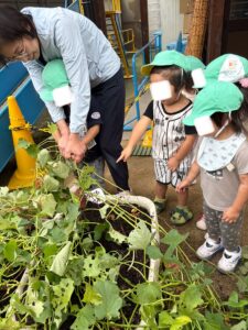 収穫の日には、「うんとこしょ!」とつるを引っぱると、土の中から大きなさつまいもが出てきて、子どもたちはびっくり&にっこり!嬉しそうな笑顔が写真からも伝わってきます。